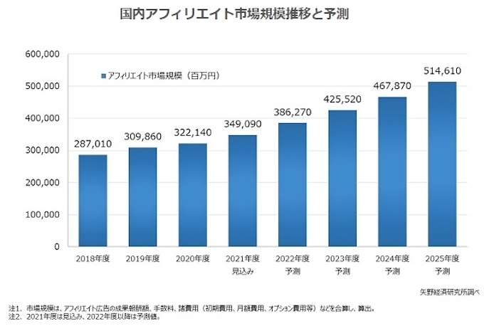 株式会社矢野経済研究所がおこなった「国内のアフィリエイト市場に関する調査2021年」での調査結果で、市場の拡大はこれからも続くと見込まれています。