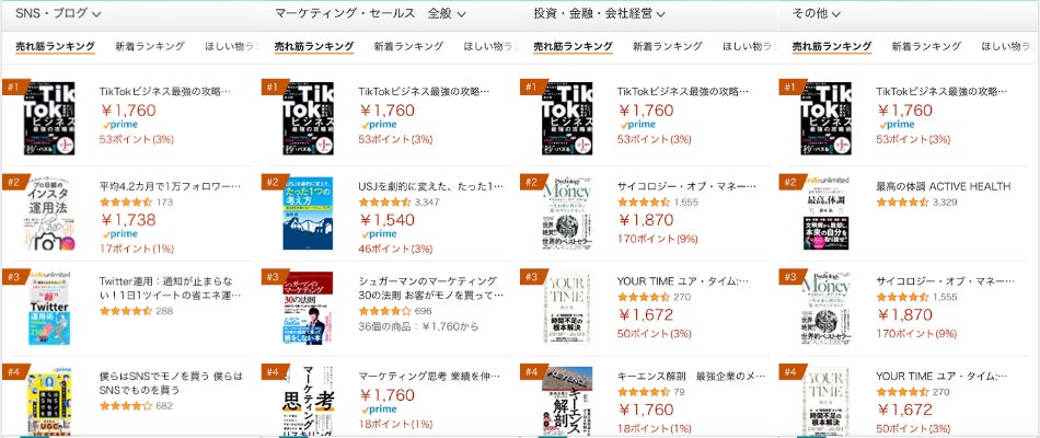 ちなみこの著書で獲得したAmazonランキングでの4冠というのは、「ビジネス・経済関連書籍」「マーケティング・セールス」「投資・金融・会社経営」「SNS・ブログ」の4部門です